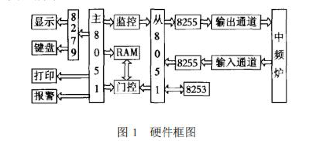 本系統是以 2 片 8051 單片機外圍接口電路構 成的一個主從式雙工中頻電爐爐溫控系統 ,硬件總體框圖如 圖 1 所示。