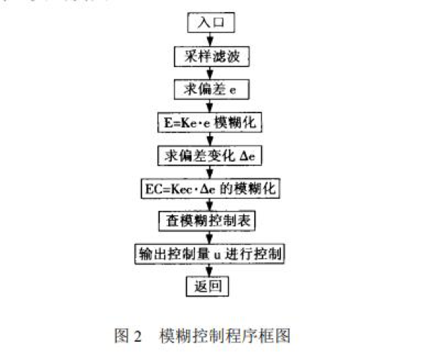 中頻爐溫度的模糊控制器是模糊控制系統的核心 ,它是一 種利用專家知識和操作者經驗設計的專家控制系 統 ,設計時不用數學解析模型來描述受控系統的 特性。在本溫度控制系統設計中 ,采用二維模糊 控制器 ,即以偏差 e 和偏差變化率Δe 作為模糊控制器的輸入變量 ,把加熱操作量作為輸出變量。 在模糊控制過程中 ,同時把偏差和偏差的變化率 作為模糊輸入量 ,這種方法不僅能保證系統控制 的穩定性 ,而且還可減少超調量和振蕩現象。根 據受控系統的實際情況 ,確定輸入變量的測量范 圍和輸出變量的控制作用范圍 ,以確定每個變量 的論域 , Ke、Kec 和 Ku 分別為輸入和輸出變量的 量化因子和比例因子。先經限幅處理 ,再經量化 處理就得到了 E 和 EC。根據當前已求得的 E 和 EC ,直接查詢模糊控制表就獲得控制量的變化值 ΔU ,將該變化值ΔU 乘以比例因子 Ku ,即可得到 當前的實際控制量增量Δu。再將該增量和前一采 樣時刻的實際控制量相加 ,就得到目前應實施的 控制動作 ,即 uk = uk - 1 + Ku ·ΔU ,其模糊控制 程序框圖如圖 2 所示。